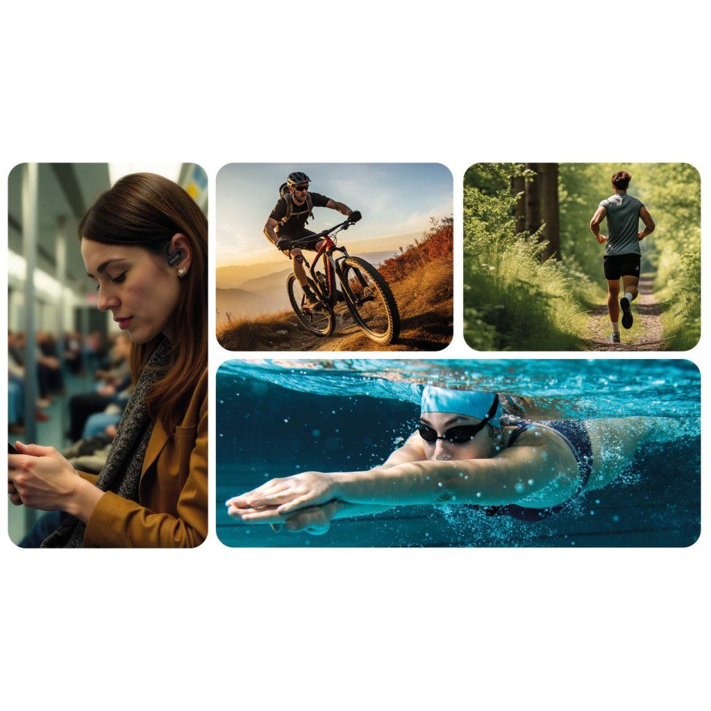 - Forradalmi Bone Conduction hangtechnológia, amely az arccsontokon keresztül továbbítja a hangot a belső fülbe, lehetővé téve a zenehallgatást és a környezet egyidejű észlelését
