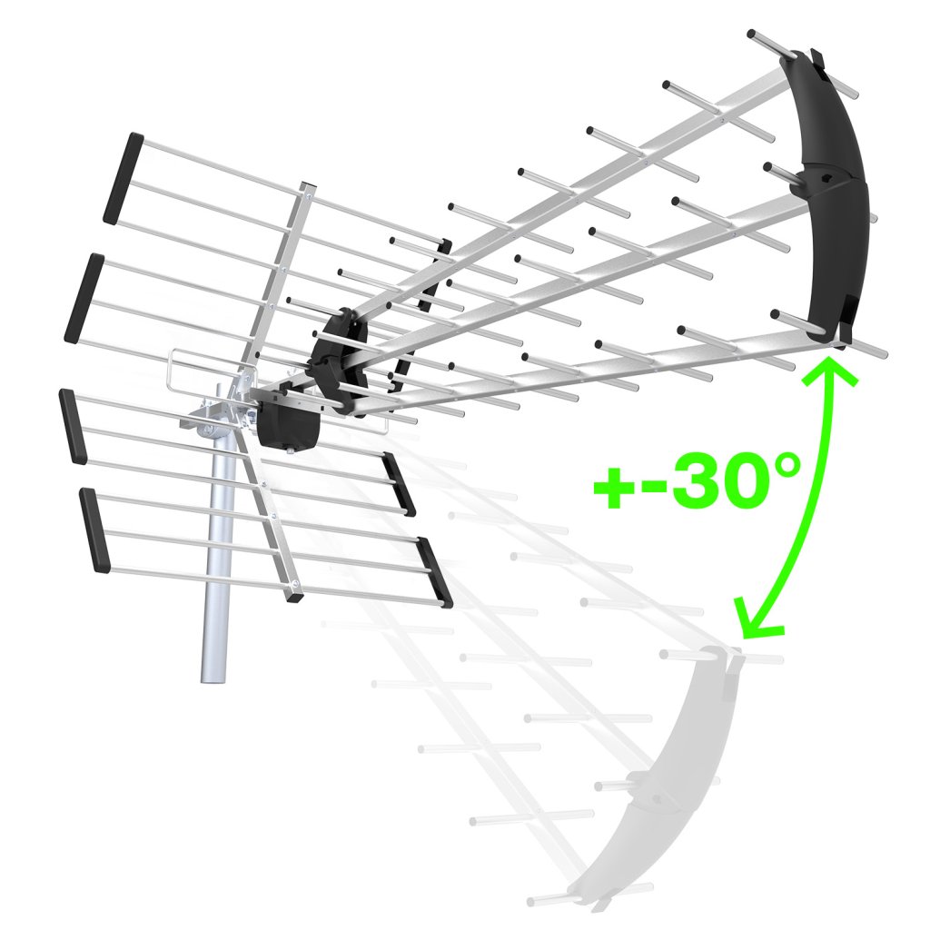 Külső passzív antenna DAB+/DVB-T2 vételére, erősítővel bővíthető, LTE szűrővel, 4G, 5G. A függőleges beállítás +/- 30°-kal növeli az antenna nyereségét azokkal az antennákkal szemben, amelyek nem rendelkeznek ezzel az állíthatósággal.