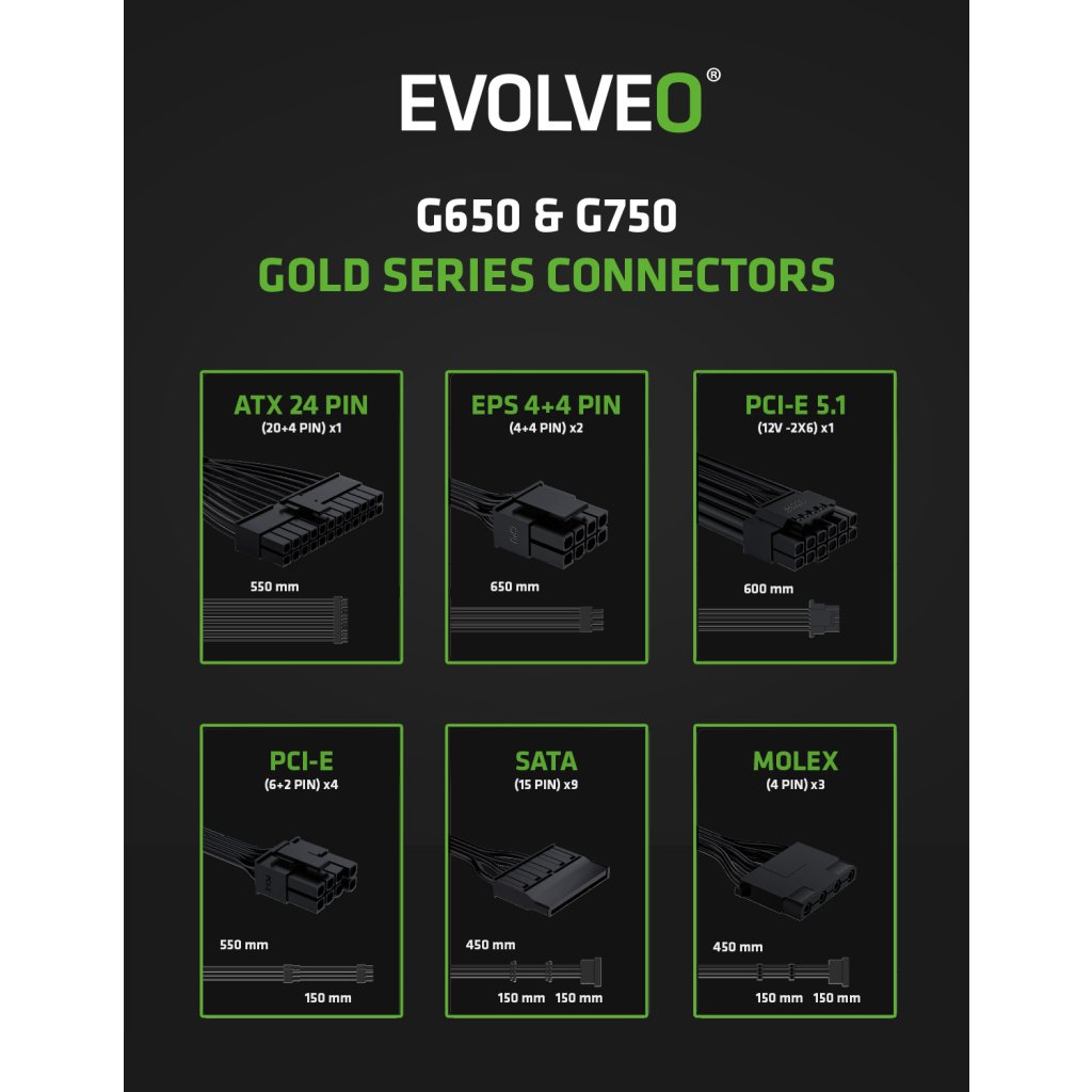 Felejtse el az összegubancolódott kábeleket, amelyek akadályozzák a levegő áramlását, és még a számítógépházának is elrontják a stílusát. Az EVOLVEO G650-WH tápegység teljesen moduláris, így csak azokat a kábeleket csatlakoztatja hozzá, amelyekre tényleg szüksége van. A csomag tartalmaz minden fontos kábelt – egy ATX 24 PIN kábel, két EPS 4+4 PIN, két PCI-E 6+2 PIN, egy PCI-E 5.1 12V-2×6, három SATA és egy MOLEX. Így minden számára van hely, a CPU-tól és GPU-tól a lemezeken át az elegáns LED szalagokig vagy egyéb extra elemekig.