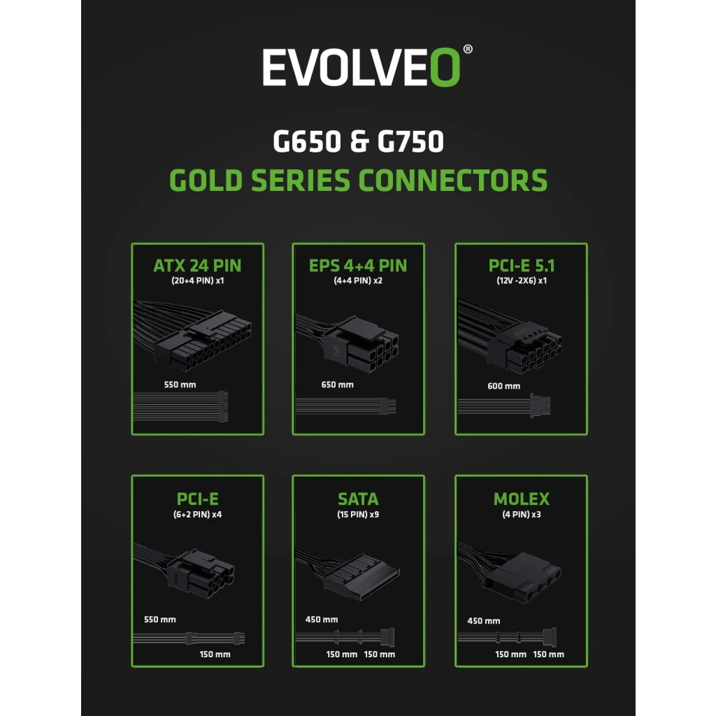 Felejtse el az összegubancolódott kábeleket, amelyek akadályozzák a levegő áramlását, és még a számítógépházának is elrontják a stílusát. Az EVOLVEO G650-BK tápegység teljesen moduláris, így csak azokat a kábeleket csatlakoztatja hozzá, amelyekre tényleg szüksége van. A csomag tartalmaz minden fontos kábelt – egy ATX 24 PIN kábel, két EPS 4+4 PIN, két PCI-E 6+2 PIN, egy PCI-E 5.1 12V-2×6, három SATA és egy MOLEX. Így minden számára van hely, a CPU-tól és GPU-tól a lemezeken át az elegáns LED szalagokig vagy egyéb extra elemekig.