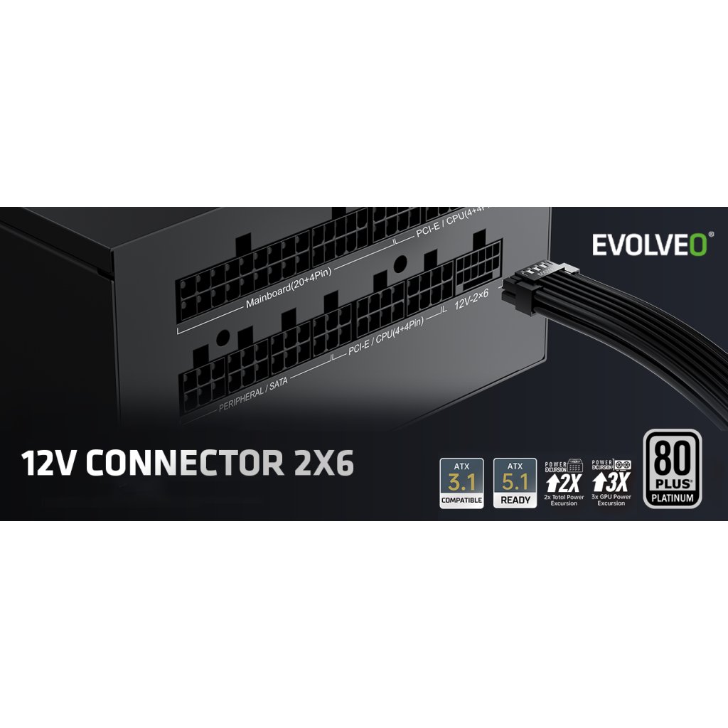 EVOLVEO P1000 tápegység 1000 W, 80+ PLATINUM, ATX 3.1, aPFC, 140 mm ventilátor, 3 év garancia, fekete