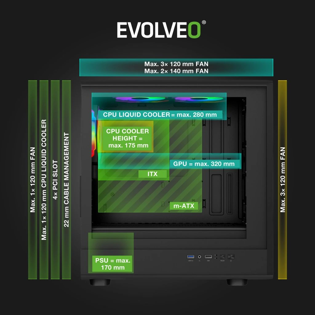 EVOLVEO Panthera, mATX ház, 6x ARGB ventilátor 120 mm, fa előlap + üveg oldalfal