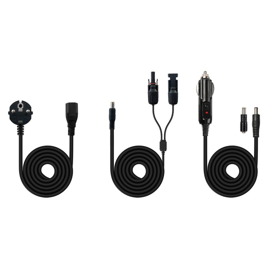 A csomag tartalmaz egy töltőkábel-készletet. Ez a készlet tartalmaz egy tápkábelt, egy autós töltőkábelt és egy napelemes töltőkábelt. Ezeknek a kábeleknek köszönhetően nemcsak konnektorról, hanem vezetés közben vagy napelem segítségével is kényelmesen töltheti töltőállomását.