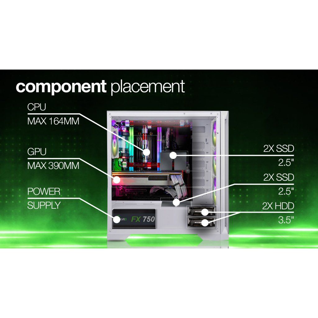 Számítógépház - ATX, mATX (Micro ATX), eATX (extended ATX) és mITX (mini ITX), opcionális előlap, a csomag tartalmaz üveg előlapot (edzett üveg) és előlapot ráccsal, 2x 3,5", 3x 2,5", 2x USB 2.0, 1x USB 3.0, fejhallgató/mikrotelefon bemenet, 4x 120mm ARGB ventilátor, CPU hűtő 164mm, grafikus kártya 280/390mm (390mm, ha a HDD keretet eltávolítják), tápegység nélkül, edzett üveg oldallap