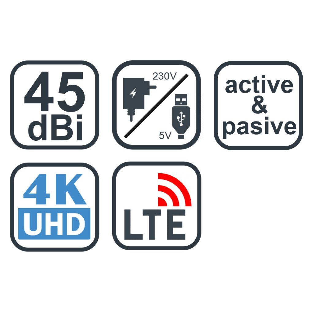 Elegáns beltéri antenna digitális és analóg TV jel vételéhez. Az antenna erősítőjét az USB-kábelnek köszönhetően kétféle módon lehet táplálni. Tápellátás 230 V-os adapteren keresztül továbbá áramellátás lehetősége az USB-csatlakozón keresztül. A másik felhasználási módot olyan felhasználó fogja értékelni, aki tévét szeretne nézni, például NB-n, USB-tuner segítségével. Az antennát 3M kétoldalas szalaggal lehet a falhoz, a bútorokhoz rögzíteni, vagy a talapzatra is helyezhető.