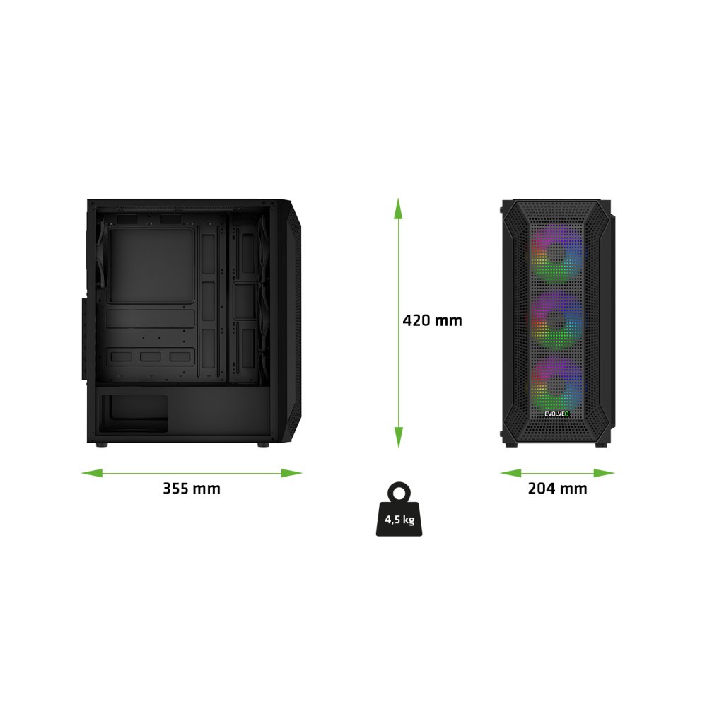 EVOLVEO Xenon, ATX ház, 4x ARGB ventilátor 120 mm, elülső panel légáramlás háló, fekete